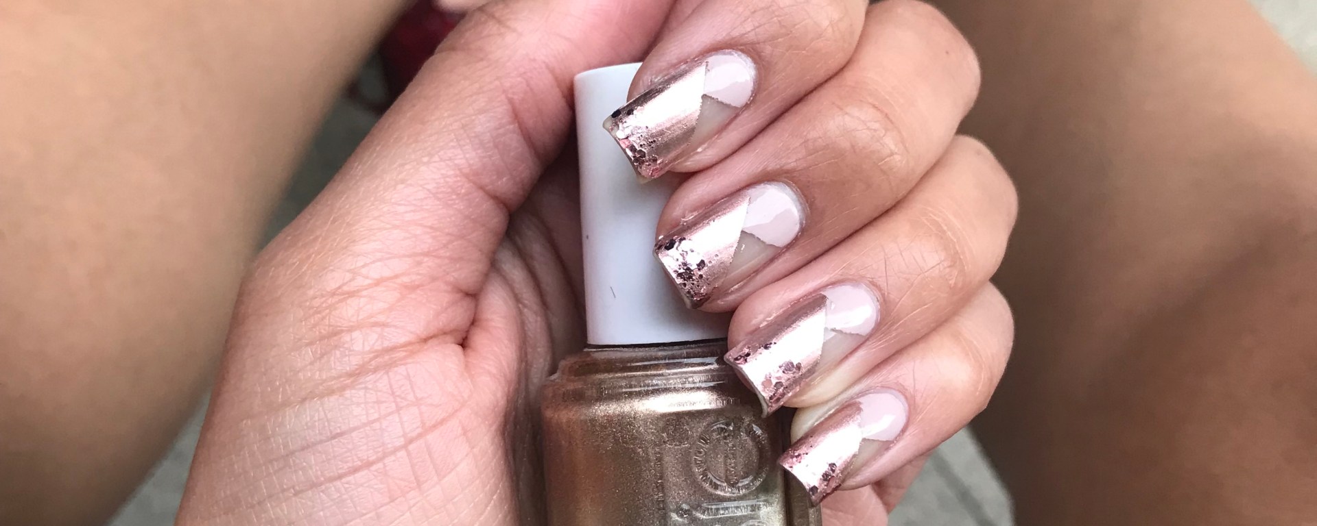 The colors I chose were a few of my favorites. OPI’s ‘Don’t Bossa Nova Me Around’ and Essie’s ‘Penny Talk’ and ‘A Cut Above’. A little negative space action and some glitter at the tip and I was all set. You can never go wrong with rose gold or blush tones. Plus pink is my favorite color so that was also a no brainer there on what color palette I should go with. I used nail tape to help me get the perfect lines. Started with ‘Don’t Bossa Nova Me Around’, let it dry for a few minutes, and then finished with ‘Penny Talk’ on top. Once that dried I used a makeup triangle to apply the glitter to make sure I got just enough coverage to grace the tip of my nail.